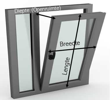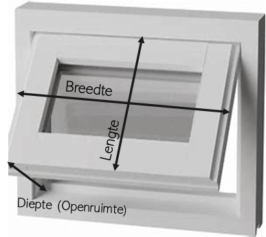 Voor klassieke ramen, open het raam volledig voor het opmeten van de dieptemaat. Zorg ervoor dat u opmeet op vanaf de rand van het kozijn tot aan de sponning. Voor het opnemen van de lengte- en breedtemaat meet u in zoals op de tekening hiernaast. Zie tekening links.
